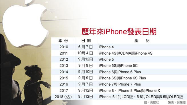 除了相关日期是每年的必考题外,苹果新款手机的亮点也是果迷关切的重点,先前有人引述供应链消息指出,今年苹果计划推出的三款手机,包含6.1吋LCD萤幕版本、5.8吋和6.5吋OLED版的新iPhone。也有分析师赶在新品发表前就发布报告,调升2018下半年新款iPhone的出货预估,并调升6.1吋LCD萤幕版本的出货比重。