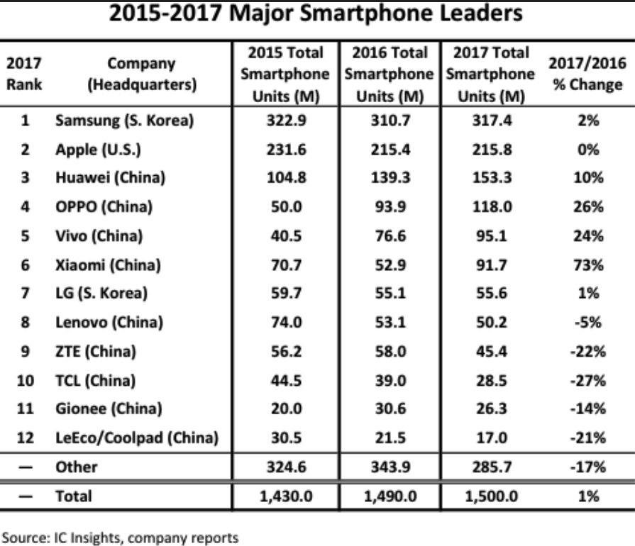 值得注意的是,排名分别为全球第一与第二大供应商的三星与苹果,联手囊括了2017年总计为15亿支的整体智能手机市场出货量三分之一以上;而排名在它们之后的是一连串中国品牌业者,包括华为(Huawei)、OPPO、Vivo、小米(Xiaomi)、联想(Lenovo)、中兴(ZTE)、TCL、金立(Gionee),以及乐视/酷派(LeEco/Coolpad)。
