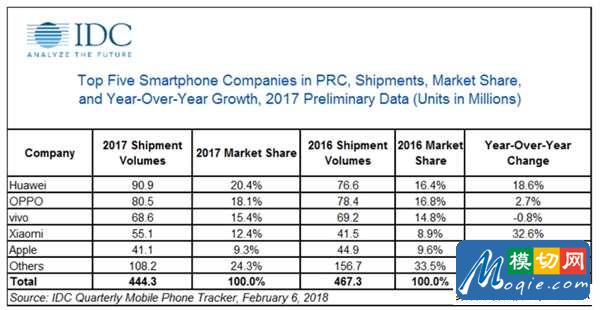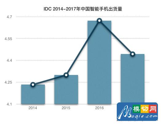 实际上这个观点可以从最近公布的一批调研数据中得到佐证。2月6日,国际知名调研机构IDC发布数据显示,2017年中国智能手机市场出货量达到4.443亿部,较2016年的4.673亿部下滑4.9%。