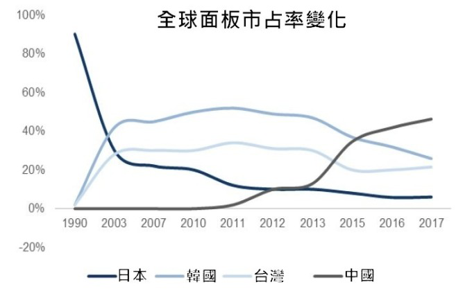 韩国、台湾、中国是目前全球三大主要面板生产基地,特别是中国,自 2011 年以来,以京东方为代表的面板企业不断扩大投资。中国也从没有面板企业到 2016 年迅速成长至 9 家的数量,而市占率也自 2011 年刚起步,迅速提升至 2017 年的 46%。