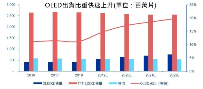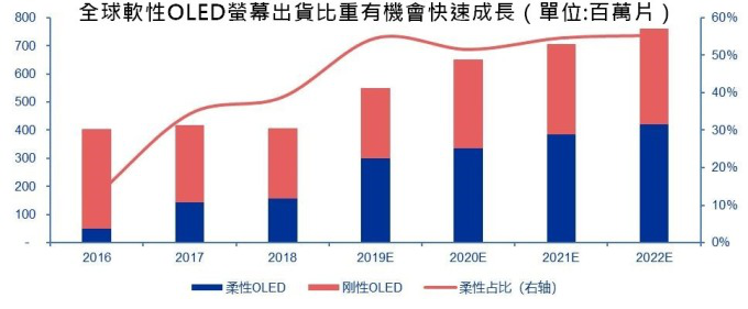根据 IHS 的数据显示,2018 年软性 AMOLED 的出货量达 1.576 亿片,预计 2022 年可升至 4.2 亿片,占 OLED 萤幕比重达 55%,年复合成长率为 22%。