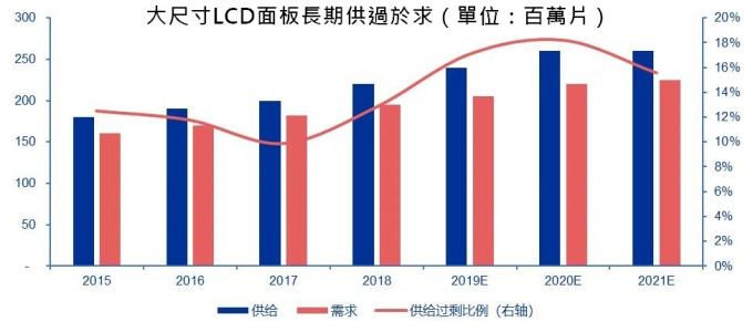 供过于求的比例将从 2018 年的 12% 上升至 2021 年的 23%,而未来大尺寸 LCD 产品的发展趋势主要在提升解析度,朝向更高画质的方向发展。