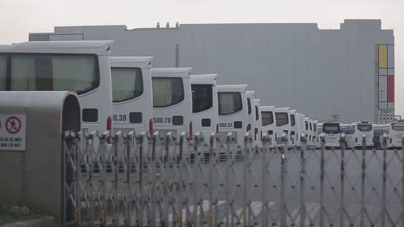 在越南博林工厂停车场,工人们搭乘的数十辆通勤巴士排起了长队。
