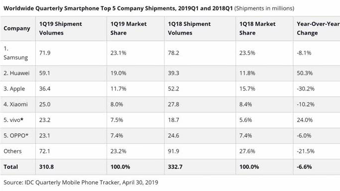 陆续出炉的调研报告都显示,今年第一季度华为手机全球出货量超过5900万部,相比去年同期增速超过50%,市场份额逼近20%,进一步拉大跟苹果的距离,坐稳第二大智能手机厂商位置的同时,华为也向老大哥三星发起了冲击。