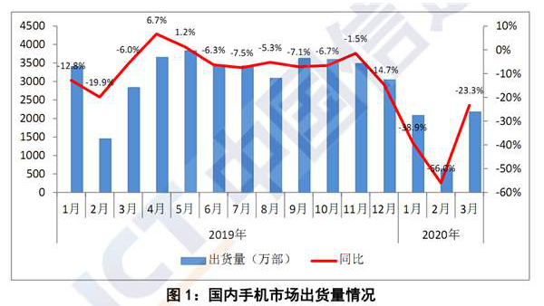 据中国信通院4月13日最新发布的数据显示:2020年3月,国内手机市场总体出货量2175.6万部,同比下降23.3%。其中2G手机出货69.8万部、4G手机出货1484.4万部、5G手机出货621.5万部。今年一月国内手机出货量同比下跌38.9%,2月疫情发展最为严重,同比下跌56%,三月份下跌得到放缓,同比下降23.3%。