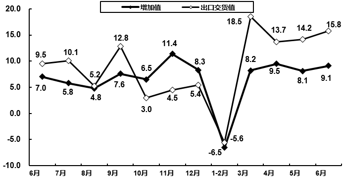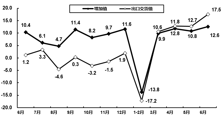 2020年6月电子信息制造业增加值和出口交货值分月增速(%)