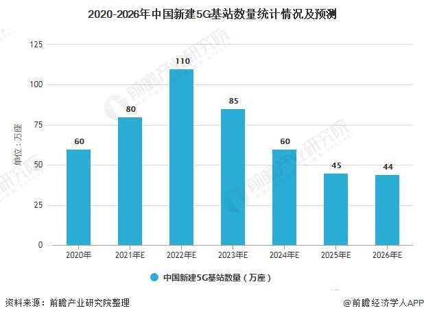 发展5G是国家重要的战略部署,2019年,工信部向中国电信、中国移动、中国联通、中国广电发放了5G商用牌照,根据工信部数据显示,我国新建5G基站数量将在2020年底达到60万个,前瞻预计我国2026年新建5G基站数量将达到44万座。