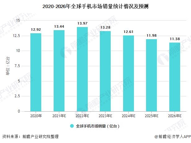 前瞻按照2020年全球手机销量12.92亿台、2021-2022年手机出货量增速为4%、2023-2026年手机出货量增速为-5%计算,前瞻预测2026年全球手机销量将达到11.38亿。