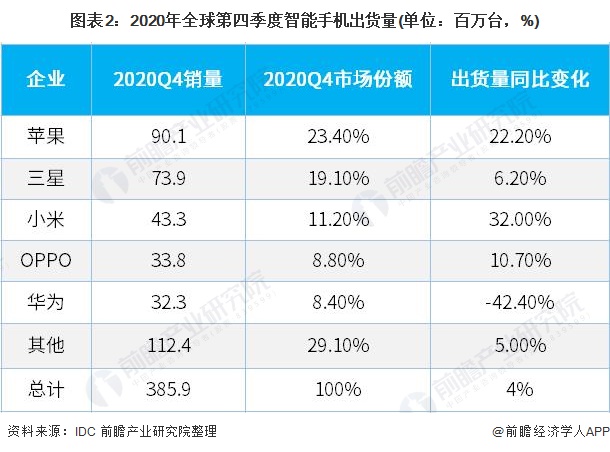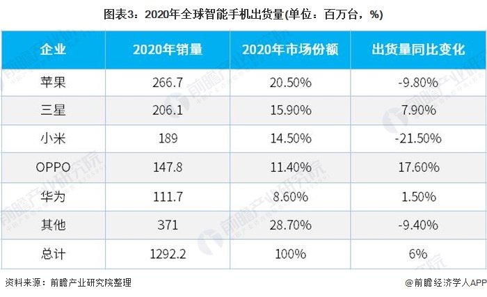 2020年全年,苹果出货量第一,销量达2.67亿台,较去年同期下降9.8%,主要系受2020年上半年新冠疫情影响。全球销量第二、三名分别为三星及小米,销量分别达2.06亿台和1.89亿台,前者较去年同期上涨7.9%,后者同比下降21.5%。
