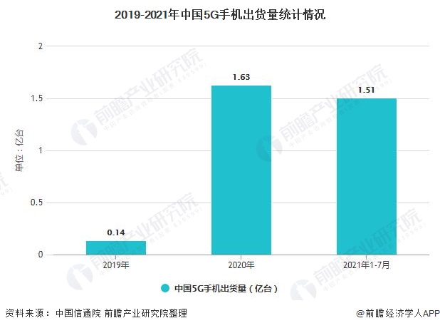 2019年,5G手机开始崭露头角,7月份5G手机销量仅占总出货量的0.2%。而据中国信息通信研究院发布的数据,2021年1-7月,国内5G手机出货量达到1.51亿部,同比增长94.3%,占同期手机出货量的74.3%,短短不到两年时间,5G新机占比几乎快达100%。