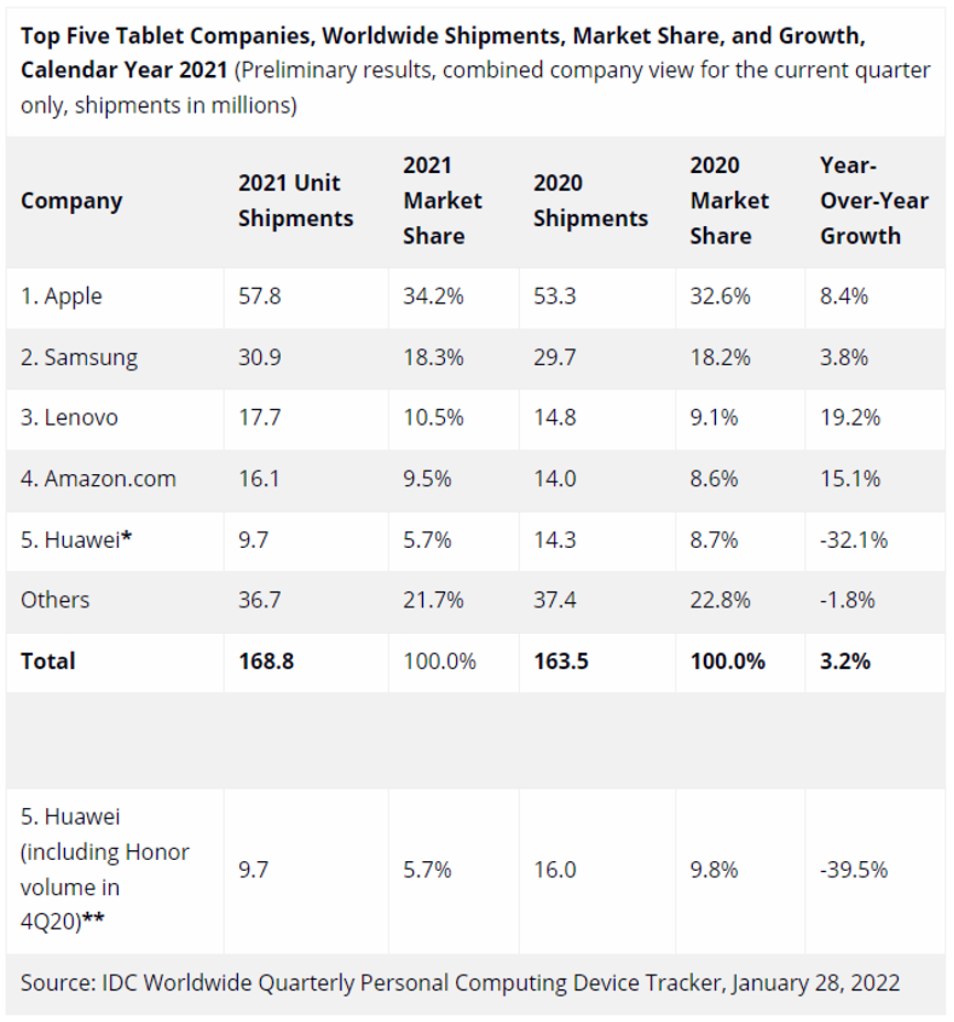 IT之家了解到,全球来看,2021年全年苹果依然是霸主,2021年共卖出了5780万台iPad,比第二第三名加起来都多,较去年同比增长了8.4%,市场份额增至34.2%。三星排名第二,2021年共卖出了3090万台,同比增长3.8%,份额18.3%。联想排名第三,在2021年销售了1777万台,同比暴增19.2%,市占率10.5%。