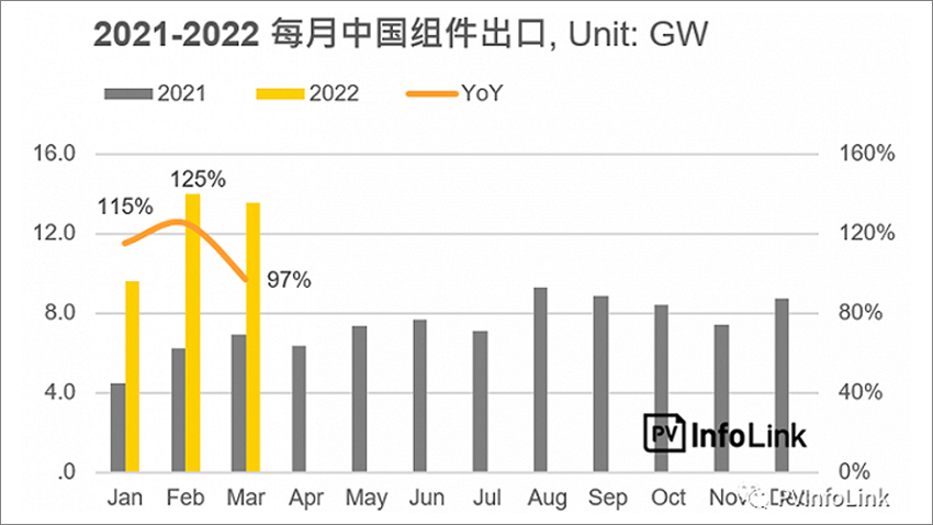 据PV InfoLink统计图表,1-3月,中国单月组件出口均较去年同期有大幅提高,同比增长率分别为115%、125%和97%。