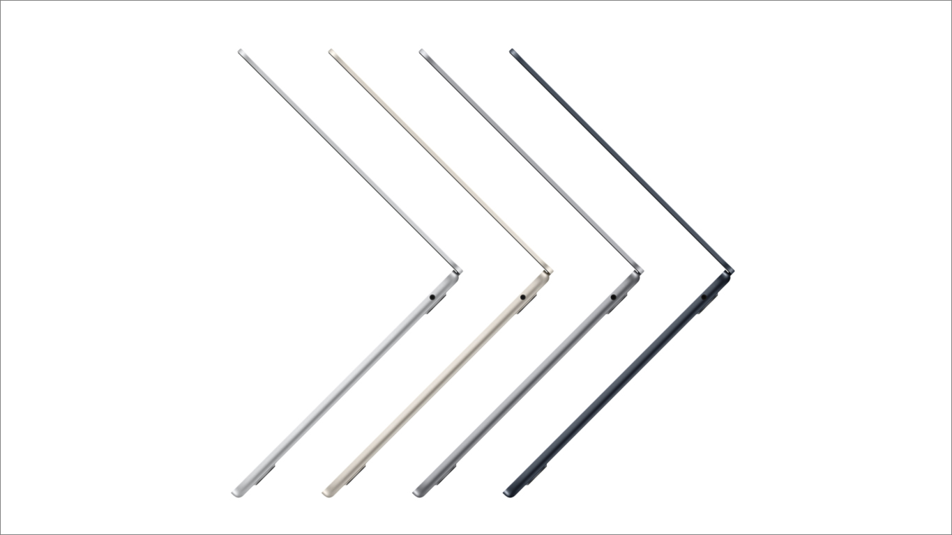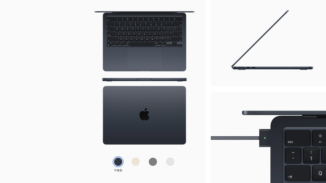 全新的MacBook Air整机厚度只有1.13厘米,比目前大部分折叠屏手机还要薄,也比套壳的iPad Pro更薄,整机重量也只有1.24千克,因为机身经过了重新设计,用了很多类似于14和16寸MacBook Pro的设计元素,刘海屏,Megsafe磁吸接口,都被拿到了全新的MacBook Air下。
