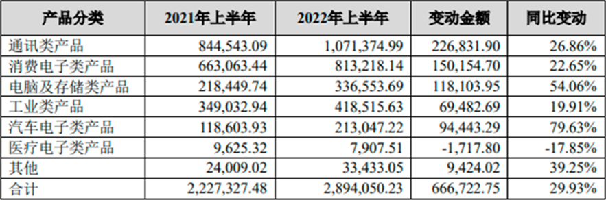 昨日(7月27日),环旭电子发布业绩快报:2022年上半年营收同比增长29.93%。细分来看,其汽车电子类产品营收同比增长79.63%,增幅远超其他产品,同期该公司电脑及存储类产品、通讯类产品、消费电子类产品营收同比增幅分别为54.06%、26.86%、22.65%。