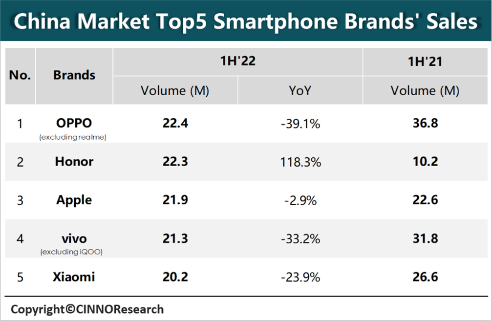 从2022年上半年的数据分析,OPPO上半年智能机销量站稳第一的位置,荣耀强势复苏,销量跃居第二,上半年销量同比大幅增长118.3%,Top5品牌销量唯一正增长;苹果 / vivo / 小米分别排名第三、第四和第五。
