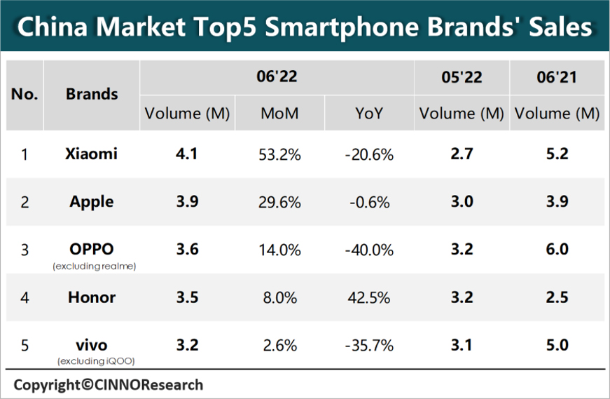 2022年上半年中国市场智能机销量同比下降16.9%!小米6月跃居中国No.1