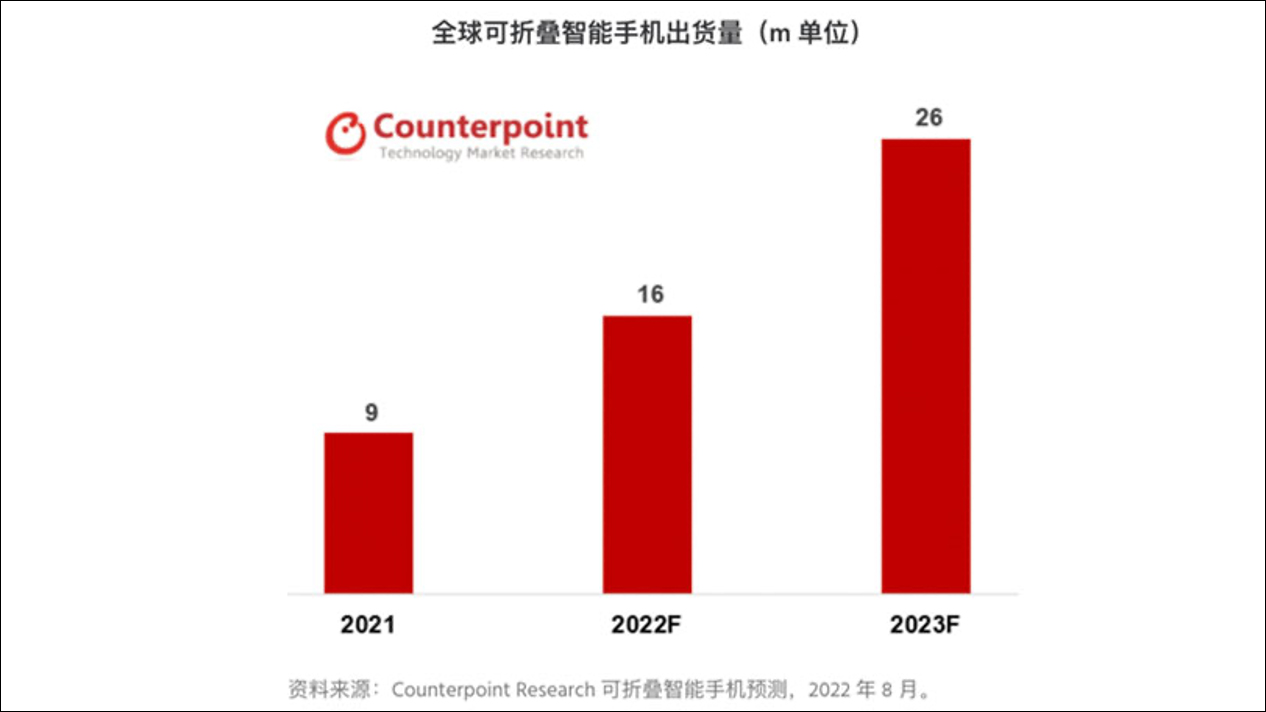据市场调查机构Counterpoint Research最新发布的折叠屏智能手机预测,今年全球折叠屏智能手机市场将从去年的900万部增长73%,至1600万部。高端市场弹性和稳定的需求,克服了经济逆风取得了强劲的增长。机构预测明年也将继续出现强劲增长,预计到2023年折叠屏手机将增长到2600万台。