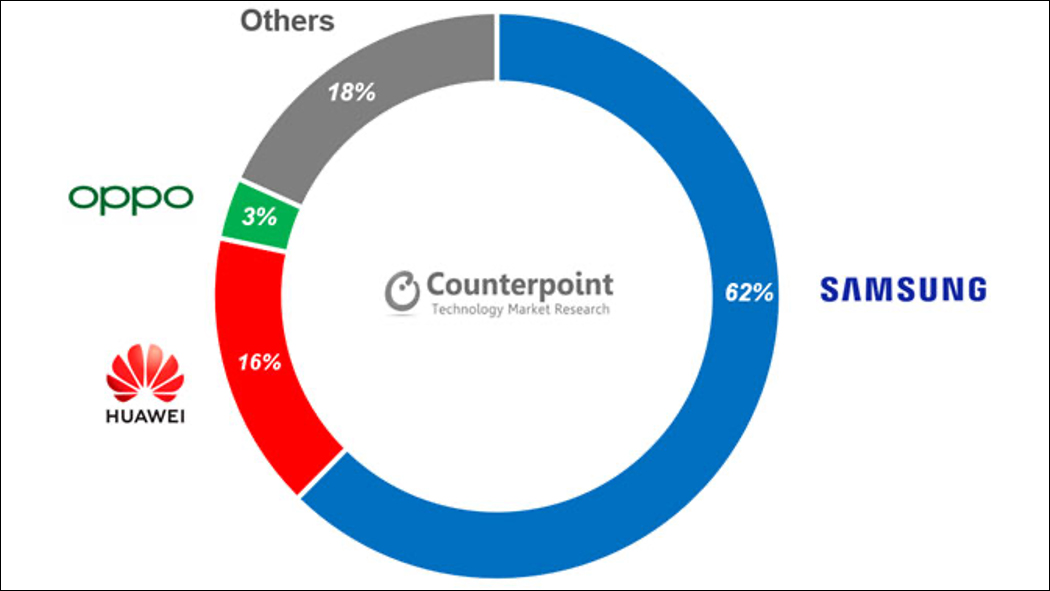 据预测,三星在今年上半年占据了折叠屏智能手机的主要市场份额,以62%市场份额坐稳第一;华为和OPPO分列第二和第三。
