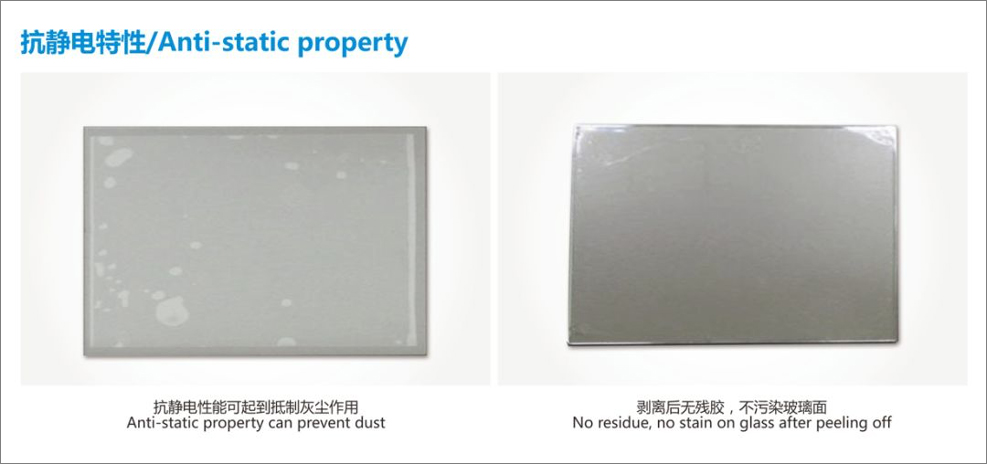 PET为基材聚氨酯胶系组合光学保护膜产品,其重复利用及良好的气密性,可作各种光学部材保护用.与传统保护膜相比,污染性低,特别适用于触摸屏用ITO玻璃加工,性能优于硅胶保护膜,主要解决硅胶保护膜白雾及局部脱胶问题。