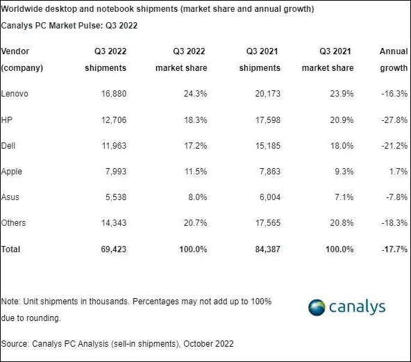 另外多个巨头在PC业绩上也面临低谷。从Canalys数据来看,联想在全球个人电脑市场保持领先地位,但第三季度出货量同比下降16%至1690万台;惠普连续两个季度在前五大厂商中跌幅最大,第三季度出货量为1270万台,同比下降28%。第三季度,联想和惠普的出货量均为2020年第一季度疫情以来的最低水平。