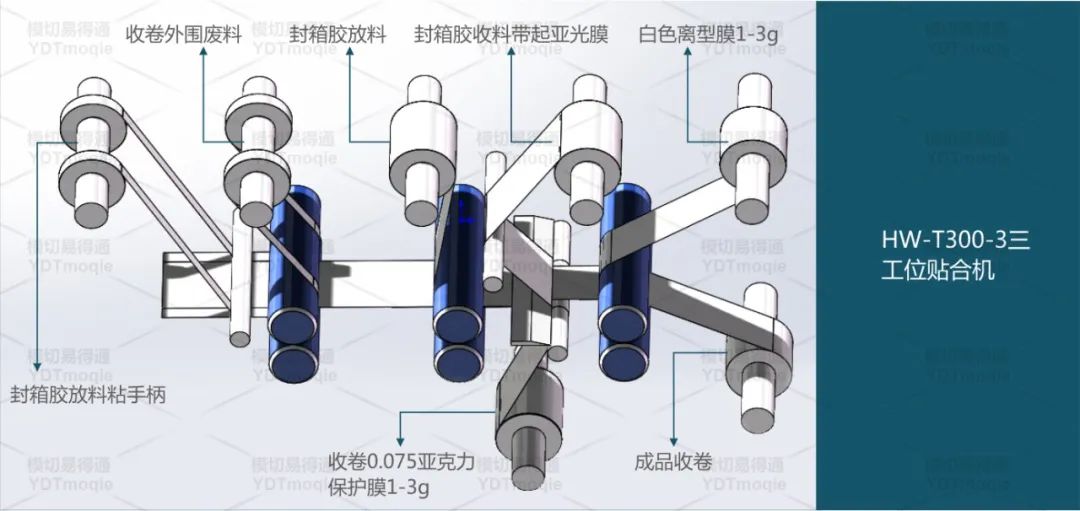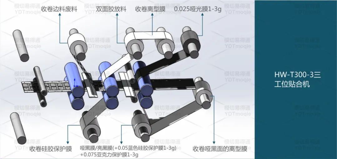 a、在贴合机上排除手柄废料;b、排除产品外围边废料;c、使用封箱胶排除产品上的哑光膜;d、覆白色离型膜1-3,同时收卷0.075亚克力保护膜,产品成型收卷。