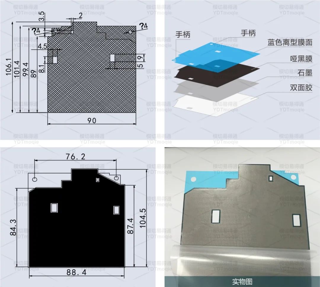 刀模往0.025哑光膜1-3g面冲切;手柄处只能冲断哑黑膜;0.05蓝色硅胶保护膜和0.075亚克力保护膜不能冲断。
