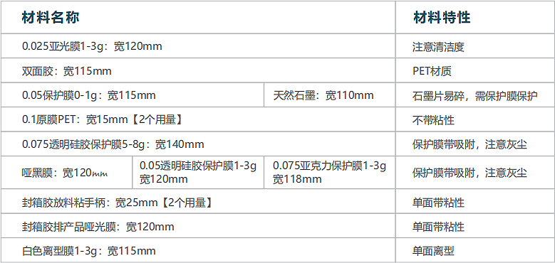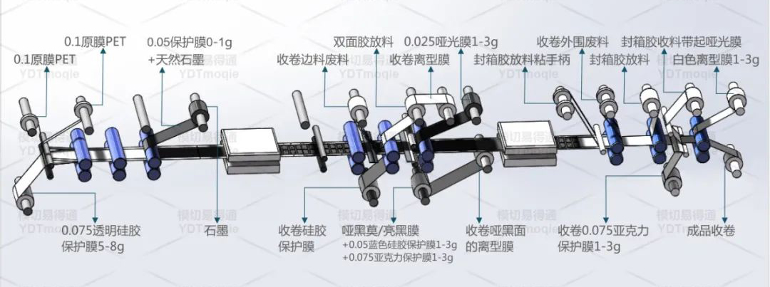 c、收卷背胶自带离型纸【膜】;d、同时覆0.025哑光膜1-3g在背胶之上;e、底部收卷硅胶保护膜,同时覆哑黑膜;+0.05蓝色硅胶保护膜1-3g;+0.075亚克力保护膜1-3g。