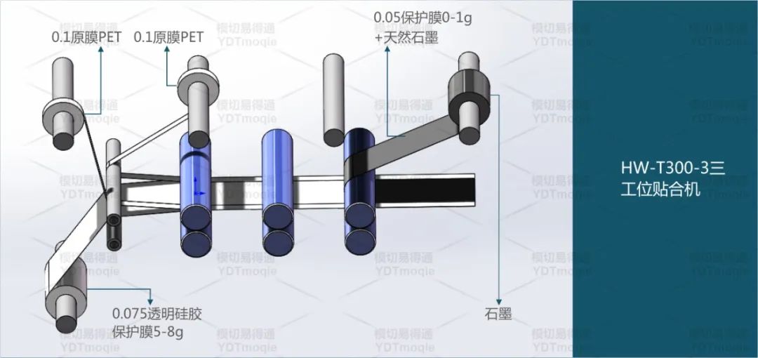 a、先将0.075透明硅胶保护膜5-8g固定好位置在贴合机上,粘性面朝上;b、再将两条0.1原膜PET靠两边贴合在0.075的透明硅胶保护粘性面上;c、将天然石墨与0.05保护膜0-1g覆合好收卷,再把石墨片覆在0.075透明硅胶保护膜上。