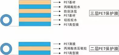 一、保护膜的生产工艺常见的保护膜是由超透明聚酯薄膜(PET)作为基膜,经涂布线涂布特殊的硅胶或亚克力胶,再贴合PET离型膜,并对于硬化处理面再贴合PET保护膜所组成的。