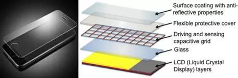 iPhone的屏幕由多层功能膜贴合压制而成,正是由于第一层(如图所示)采用了漫反射材料的光学膜涂布,用户才得以在强光下依然拥有不错的浏览体验。