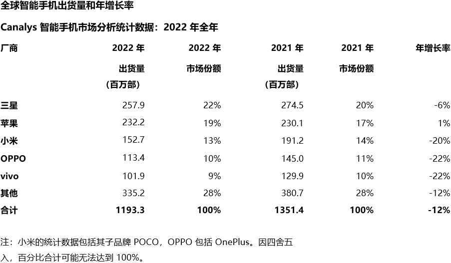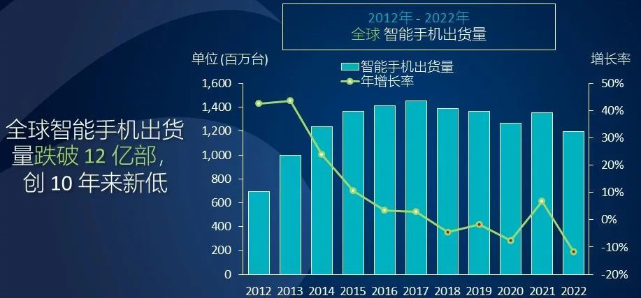 由于需求疲软,2022年各厂商的总出货量不足12亿部,导致全球年出货量下降12%。