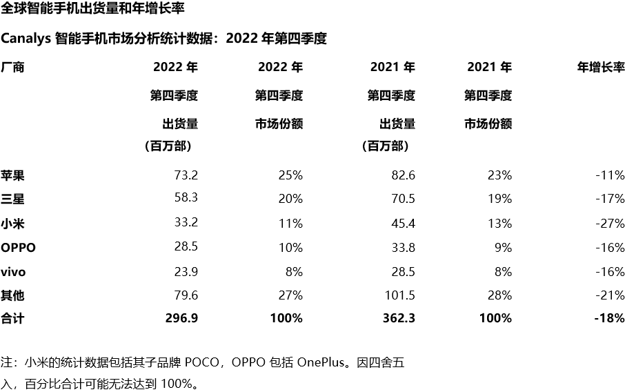 以市场占有率来看,2022年第四季,苹果、三星、小米排名前三,苹果市占比上升至25%,超越三星;与2021年第四季相比,苹果的市占率增长了2%,三星和OPPO增长了1%,vivo保持不变,小米则下降了2%。