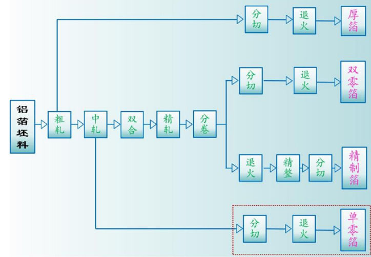 制成铝箔坯料之后,铝箔坯料经过一系列粗轧、中轧和精轧成不同厚度的铝箔,然后进行成品退火。通常来说,厚箔仅需经过粗轧,单零箔需要经过粗轧和中轧,双零箔以及其他精度要求较高的铝箔则需经过粗轧、中轧和精轧。
