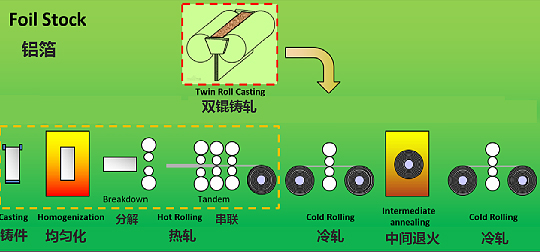 首先将铝熔体铸成扁锭,再经过均匀化、热轧、冷轧、中间退火等工序后,继续冷轧成厚度约为0.4~1.0mm的板材作为箔材坯料(熔铸→热轧开坯→冷轧→箔轧)。