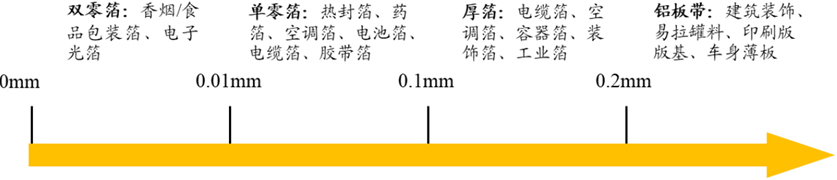 按照厚度划分,铝箔可分为双零箔、单零箔和厚箔。双零箔是指在其厚度以mm为计量单位时小数点后有两个零的箔(即厚度<0.01mm);同理,单零箔是指以mm为计量单位时小数点后有一个零的箔(0.01mm≤厚度<0.1mm);厚箔是指厚度介于0.1mm到0.2mm之间的铝箔。