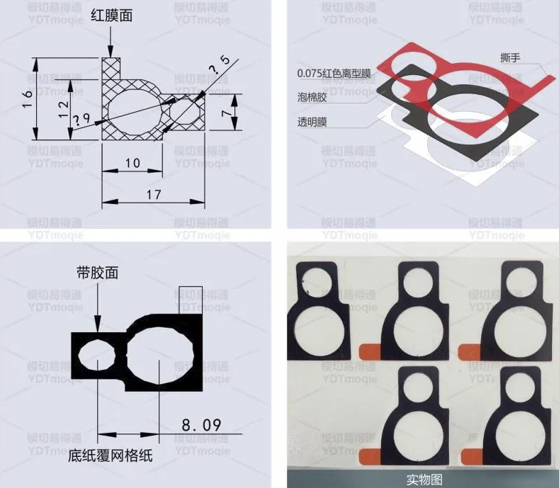 d. 二冲冲切注意事项:刀模往红膜面冲切,0.075透明离型膜不能冲断。