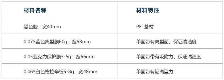 d. 二冲冲切注意事项:刀模往0.075蓝色离型膜面冲切,底部0.065白色格拉辛纸不能冲断。