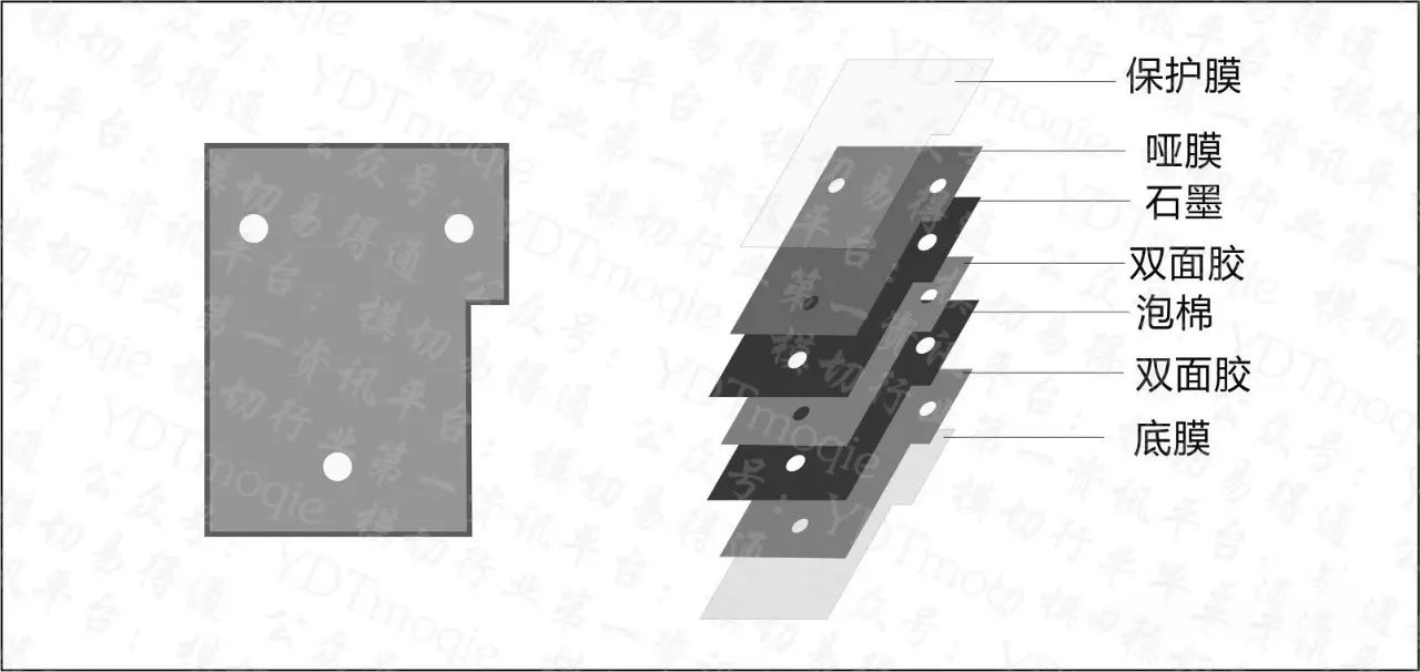 2. 底膜(离型膜)+双面胶+泡棉+双面胶+石墨+哑膜(1面有胶)+保护膜。