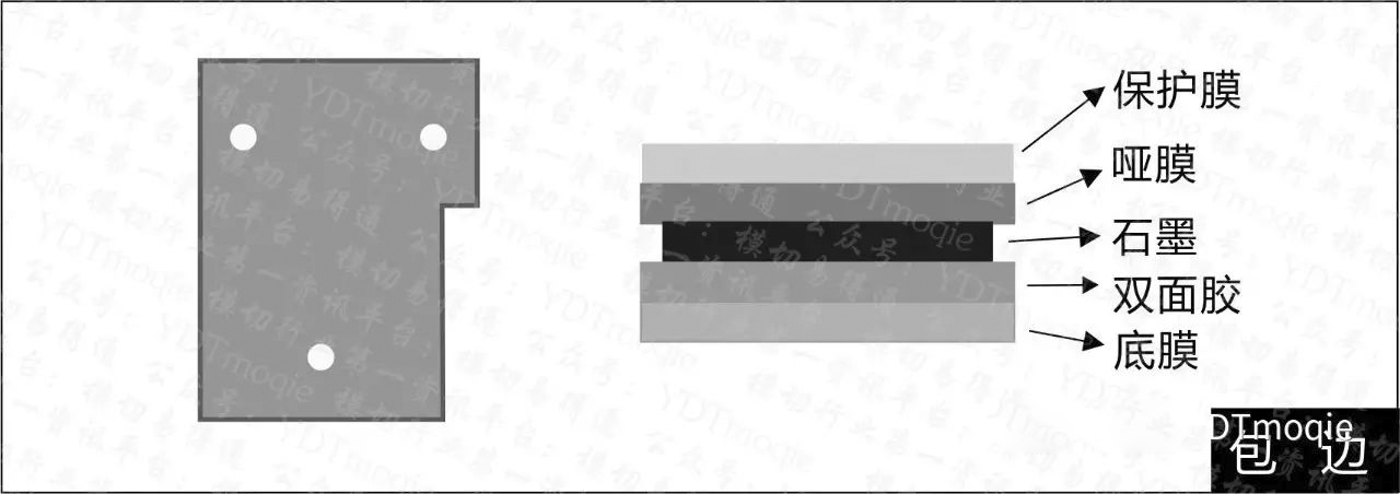 2. 包边是石墨是比较小,双面胶跟哑膜比石墨大。先把石墨冲切成形排掉外围后,复上双面胶跟哑膜,用保护膜把四边都住,就可以。