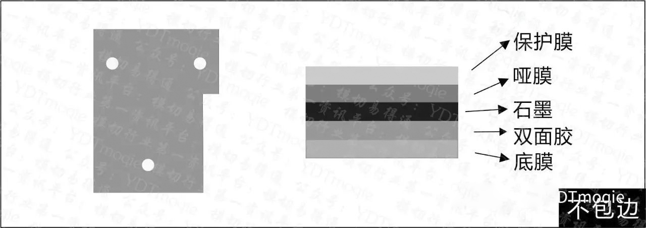 1. 底膜(离型膜)+双面胶+石墨+双面胶+石墨+麦拉胶+保护膜。