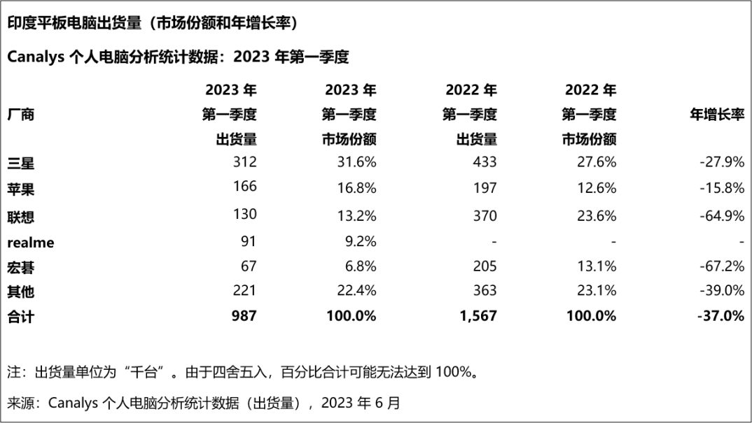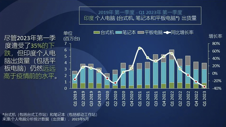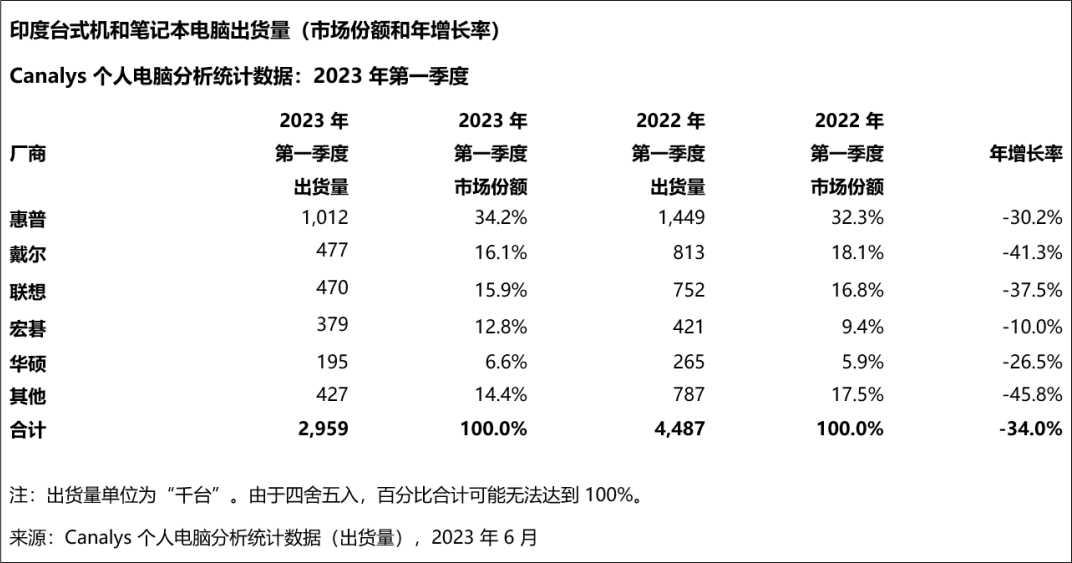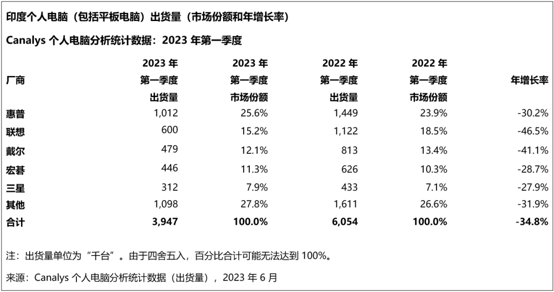 2023Q1印度PC报告:前五厂商跌幅均为两位数,最高46.5%