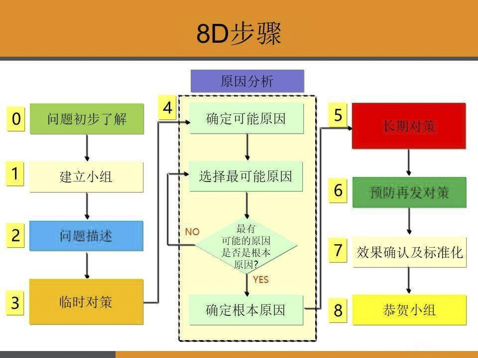 8D的原名叫做8 Eight-Disciplines,意思是8个人人皆知解决问题的固定步骤;也可以称为TOPS(TeamOriented problem solving)即团队导向问题解决方法。