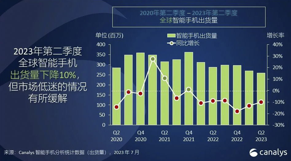 研究机构Canalys发布统计数据,显示2023年第二季度,全球智能手机出货量同比下降10%,达到2.58万亿部,市场衰退有所放缓。