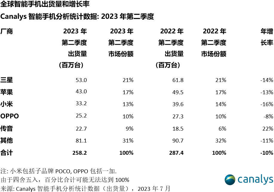 Canalys分析师刘艺璇表示,“得益于厂商的库存全面正常化,以及部分地区市场需求的温和复苏,全球智能手机市场的跌幅再次收窄。三星采取保守态度,此外第二季度是传统淡季,因此三星经历了自2013年以来的历史低谷。随着Galaxy Z Flip 5、Fold 5高端机型的发布,表明了三星在高端市场与苹果一争高下的野心。与此同时,传音抓住中东非市场潜在的低端市场的需求和稳定的外汇情况,增加渠道伙伴的信心。传音未来预计能够充分渗透低端市场。”