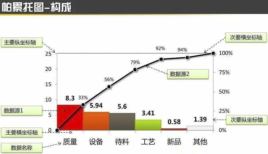 帕累托图由意大利经济学家帕累托命名。帕累托图又叫排列图、主次图,是按照发生频率的顺序绘制的直方图,表示有多少结果是由已确认类型的原因所造成。它是将出现的质量问题和质量改进项目按照重要程度依次排列而采用的一种图表,可以用来分析质量问题的主要因素。按等级排序可以让项目小组首先针对原因中所占比例最高的原因进行改善。
