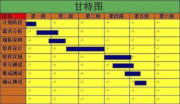甘特图(Gantt chart)又称为横道图、条状图(Bar chart)。其通过条状图来显示项目,进度,和其他时间相关的系统进展的内在关系随着时间进展的情况。以提出者亨利·L·甘特(Henrry L·Ganntt)先生的名字命名。