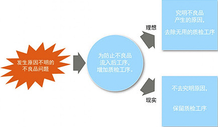 问题是,质检工序设置之后依旧会产生不良品,企业往往不究明其中的原因,只会不断地推行检查。