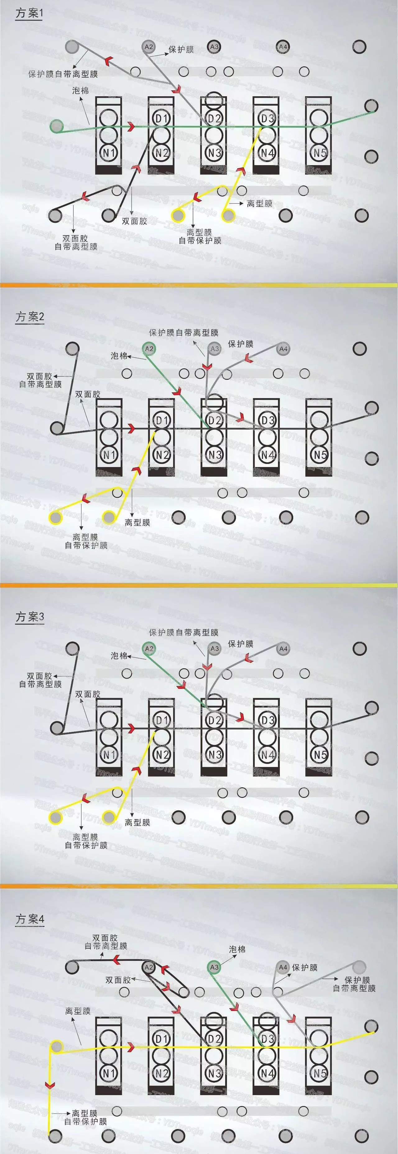 使用平刀模切设备,只能按部就班进行贴合,但使用圆刀模切设备进行作业,每个圆刀模切师傅都有自己的想法,而圆刀设备,能把不同的想法实现。同样结构的材料复合,圆刀机实现方法: