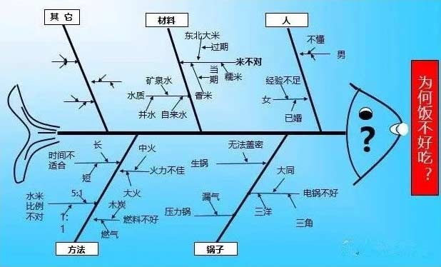1、何为特性要因图:1953年,石用馨教授所提出的一种以把握结果(特性)与原因(要因)的极方便而有效的方法。特性要因图就是能一目了然的表示出结果(制品的特性)与在(影响特性的要因)之影响情形或二者之间的关系之图形。因其形状很像鱼骨,故又称为“鱼骨图”。