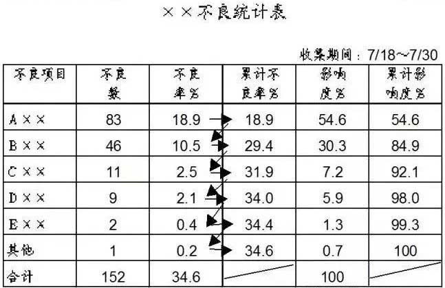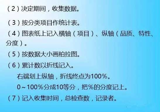 4、注意事项:(1)横轴依项目别大小顺序排列,其他项排最后;(2)横轴距离相同;(3)纵轴是品质特性,如不良率(数)、缺点数;(4)最高尺度包含总数;(5)适用于计数值。